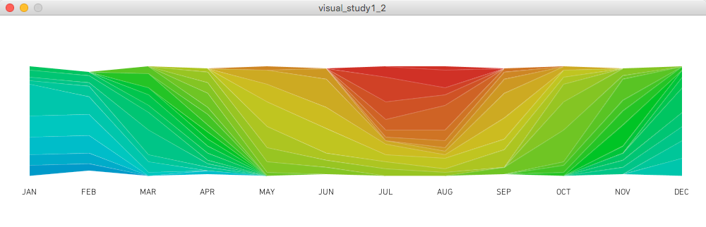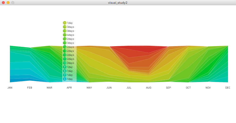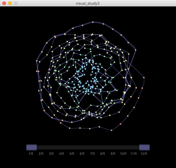 この実習では1つのデータに対する複数の視覚化を試すことによって、これまでの実習で学習してきた形態、色彩、運動、インタラクションを統合するメディアを作成します。